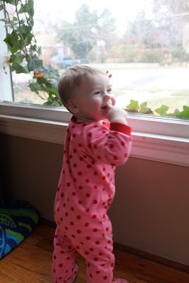 Jane clapped her hands for the first time today! She was watching a baby video and got really excited about the music, and just started clapping her hands. Normally when she's excited she waves her arms up and down, but today when she was eating lunch I clapped for her when she took good bites, and I think she must have picked up on it. Michael took a video, and even though I'm embarrassed that I look like a ragamuffin, I have to share it because it was her first time clapping her hands!